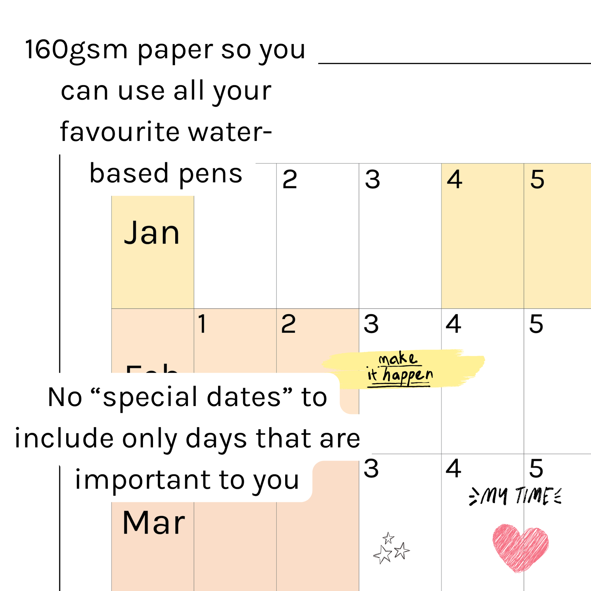 Monthly Overviews: Each month is clearly displayed for at-a-glance planning and quick reference, keeping your year neatly arranged and accessible.