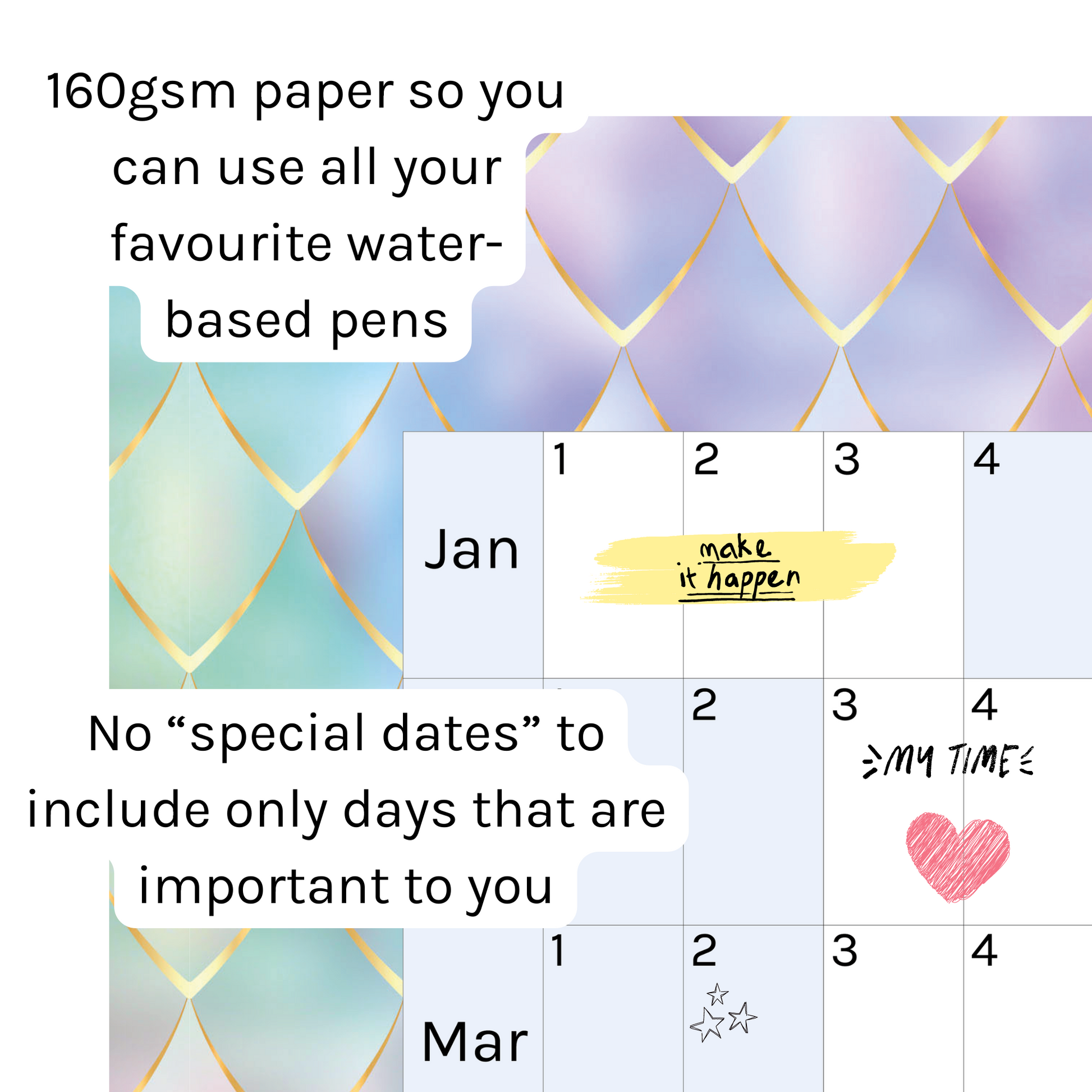 Bring a splash of oceanic magic into your life with the Mermaid Tail 2025 Horizontal Wall Planner. Inspired by the delicate beauty of shimmering mermaid scales, this planner is the perfect combination of whimsical elegance and practical organisation, helping you stay on top of your year in style.