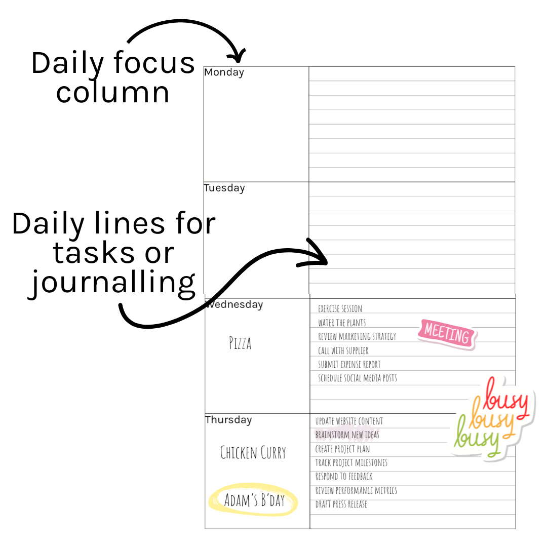 - Daily Focus & Task Lines: Use the focus column to set your main goal or intention for each day, with plenty of space below to jot down tasks, appointments, or journaling entries.