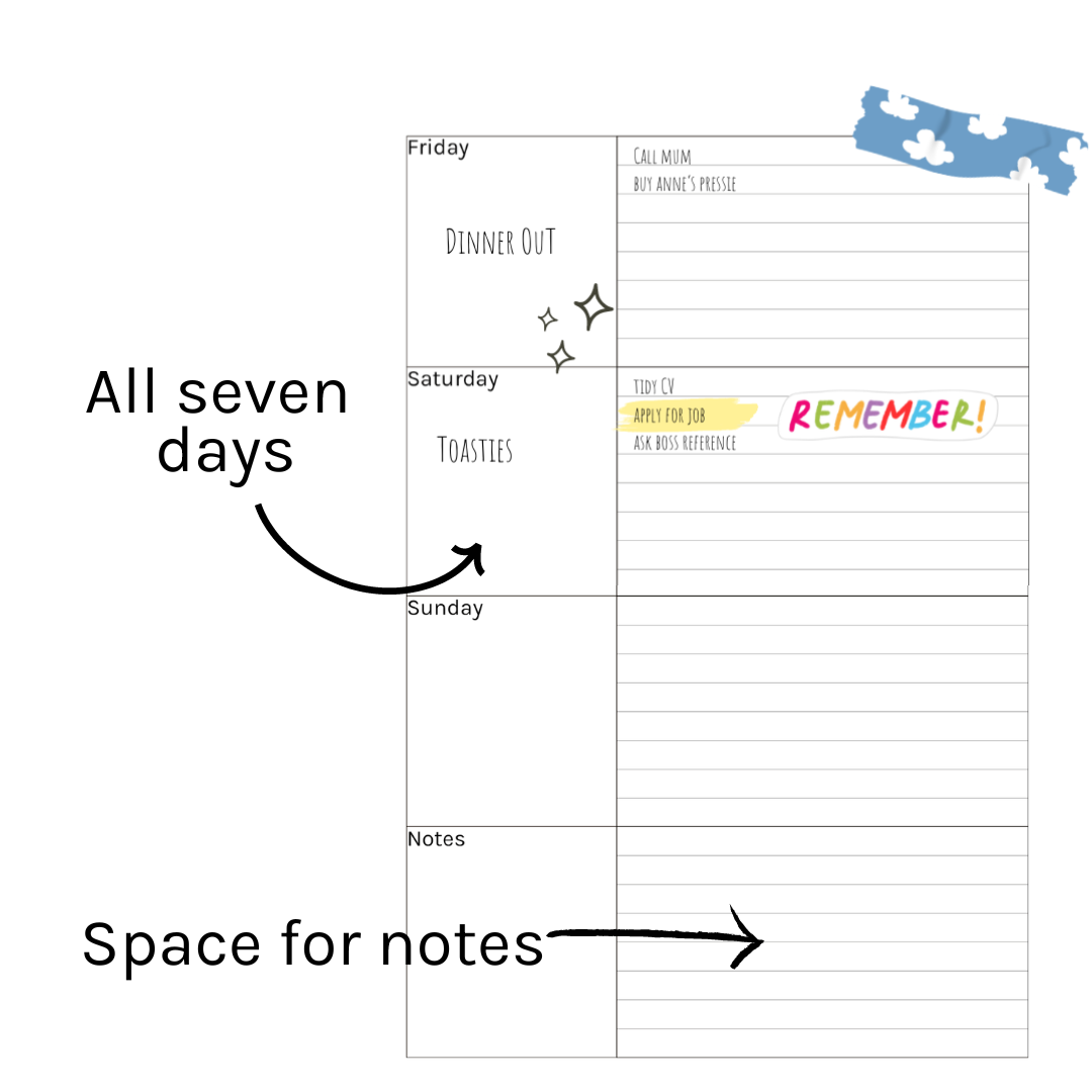 - Simple, Customisable Layout: The minimalist design offers room for your creativity while giving you structure for your week.