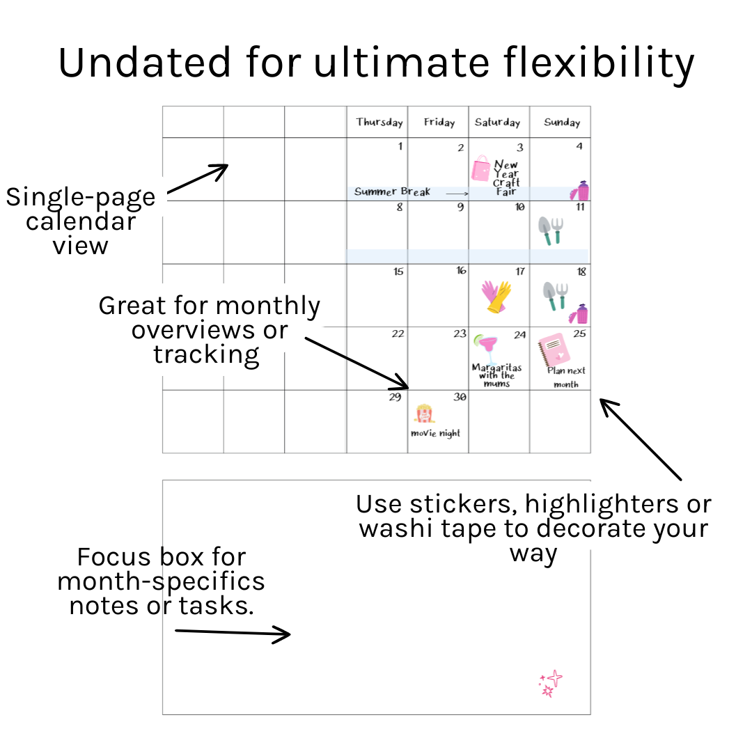- Undated for Ultimate Flexibility: Start planning whenever you want. With no pre-filled dates, you can customise each month and begin your journey to organization at any time.