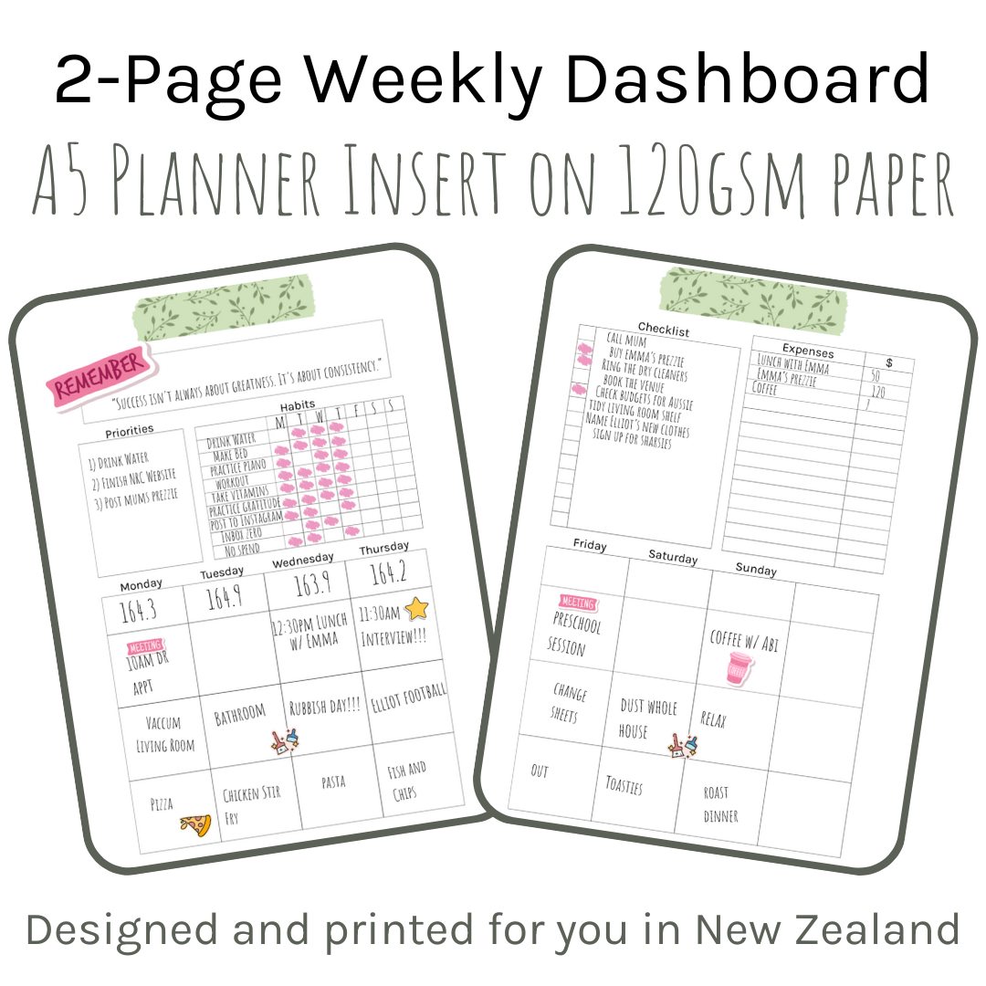 Elevate your planning game with our meticulously crafted 2-Page Weekly Dashboard A5 Planner Inserts. Designed and printed right here in New Zealand on premium 120gsm paper, these inserts are perfect for those who value organization and style in equal measure.