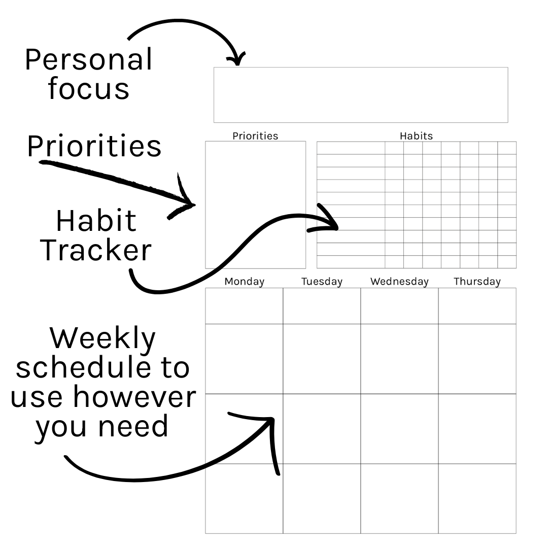 - Personal Focus & Priorities: Define your weekly focus and set clear priorities with dedicated sections, helping you stay on track and achieve your goals.